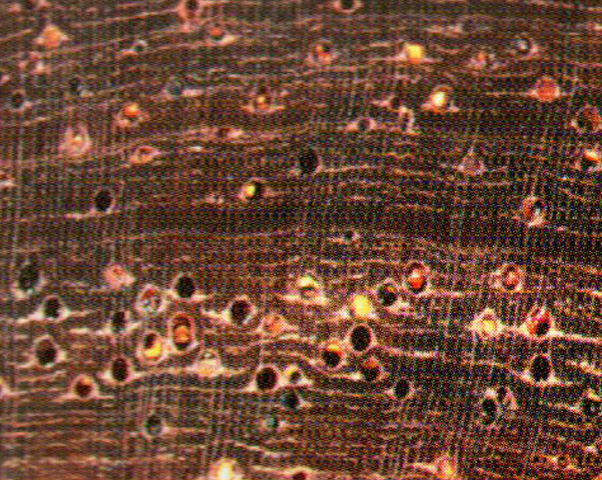 散孔材。管孔肉眼下略見,甚少至略少,大小(xiǎo)中(zhōng)等;主為(wèi)單管孔。少數徑列複管孔(2-3個);富含黑褐色樹膠,部分(fēn)管孔内可(kě)見金黃色的沉積物(wù)。類似檀香紫檀的金星,軸向薄壁組織放大鏡下明顯,主為(wèi)不規則斷續細線(xiàn)狀,還有(yǒu)部分(fēn)翼狀和環管狀。木(mù)射線(xiàn)放大鏡下可(kě)見,密至甚密,甚窄。波痕明顯。
