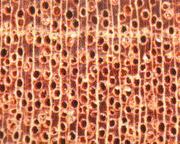 散禮材。管孔肉眼下明顯,略多(duō),大小(xiǎo)中(zhōng)等;單管孔;部分(fēn)斜列;侵填體(tǐ)豐富,軸向蒲壁組織放大鏡下可(kě)見,環管束狀或近翼狀。本射線(xiàn)肉眼下略見。略密,略寬。軸向樹膠道内眼下明顯,長(cháng)弦列白色點狀。